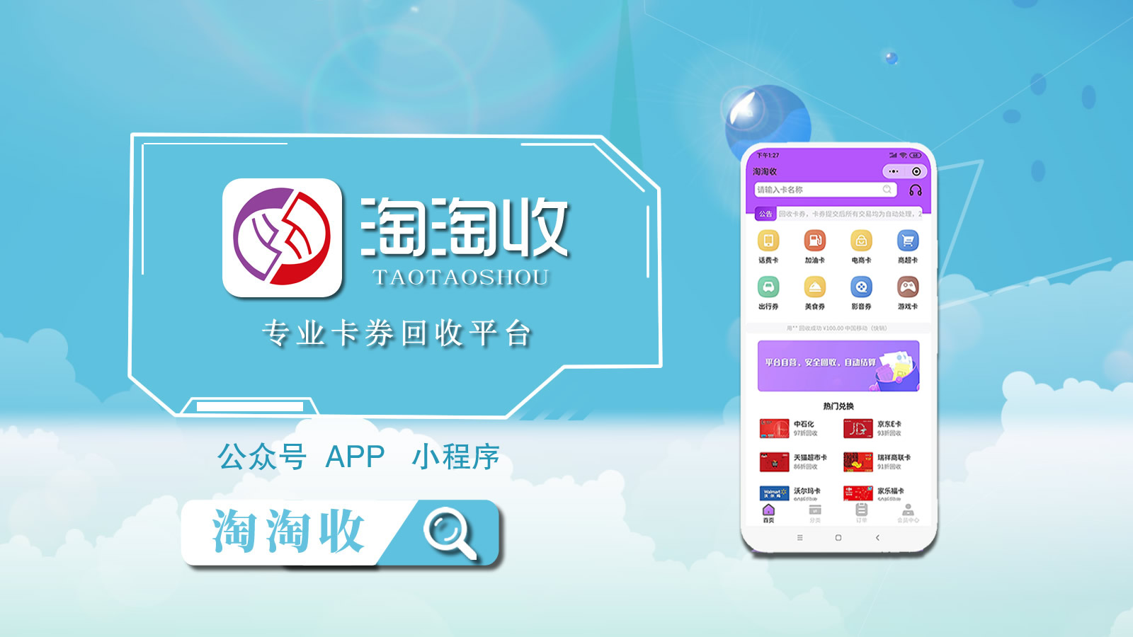 第一步:微信搜并关注“淘淘收”公众号。搜索我们要回收的卡