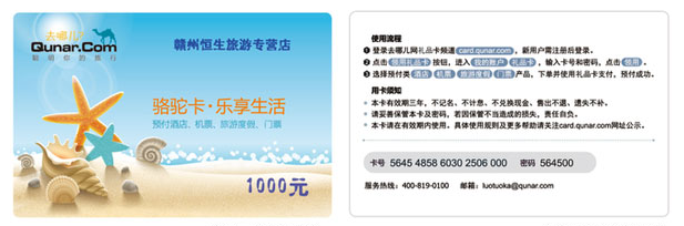 去哪儿礼品卡为实体卡,您可从卡背面刮开获取卡号和卡密