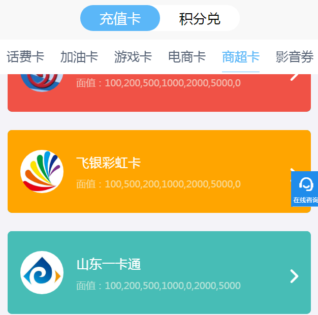 第三步:找到山东一卡通,选择卡上相应的面值,输入卡号卡密。