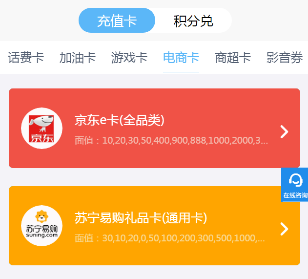 第三步:找到京东e卡,选择卡上相应的面值,输入卡号卡密。