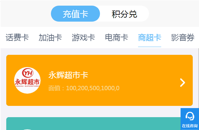 第三步:找到永辉超市购物卡,选择卡上对于的面值,输入【卡号卡密】。