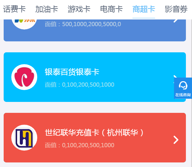 第三步:找到世纪联华购物卡,选择卡上对于的面值,输入【卡号卡密】