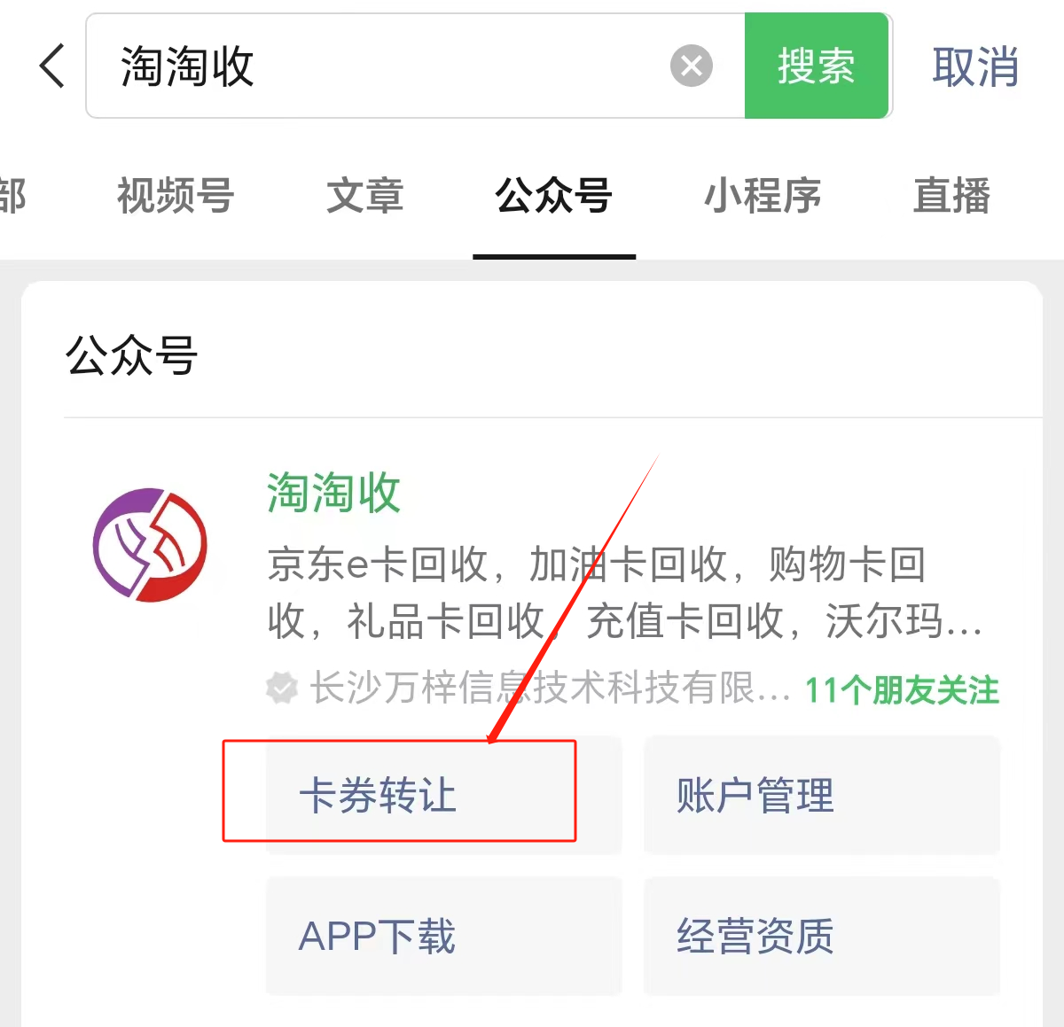 第1步:微信搜索淘淘收,选择卡券转让;